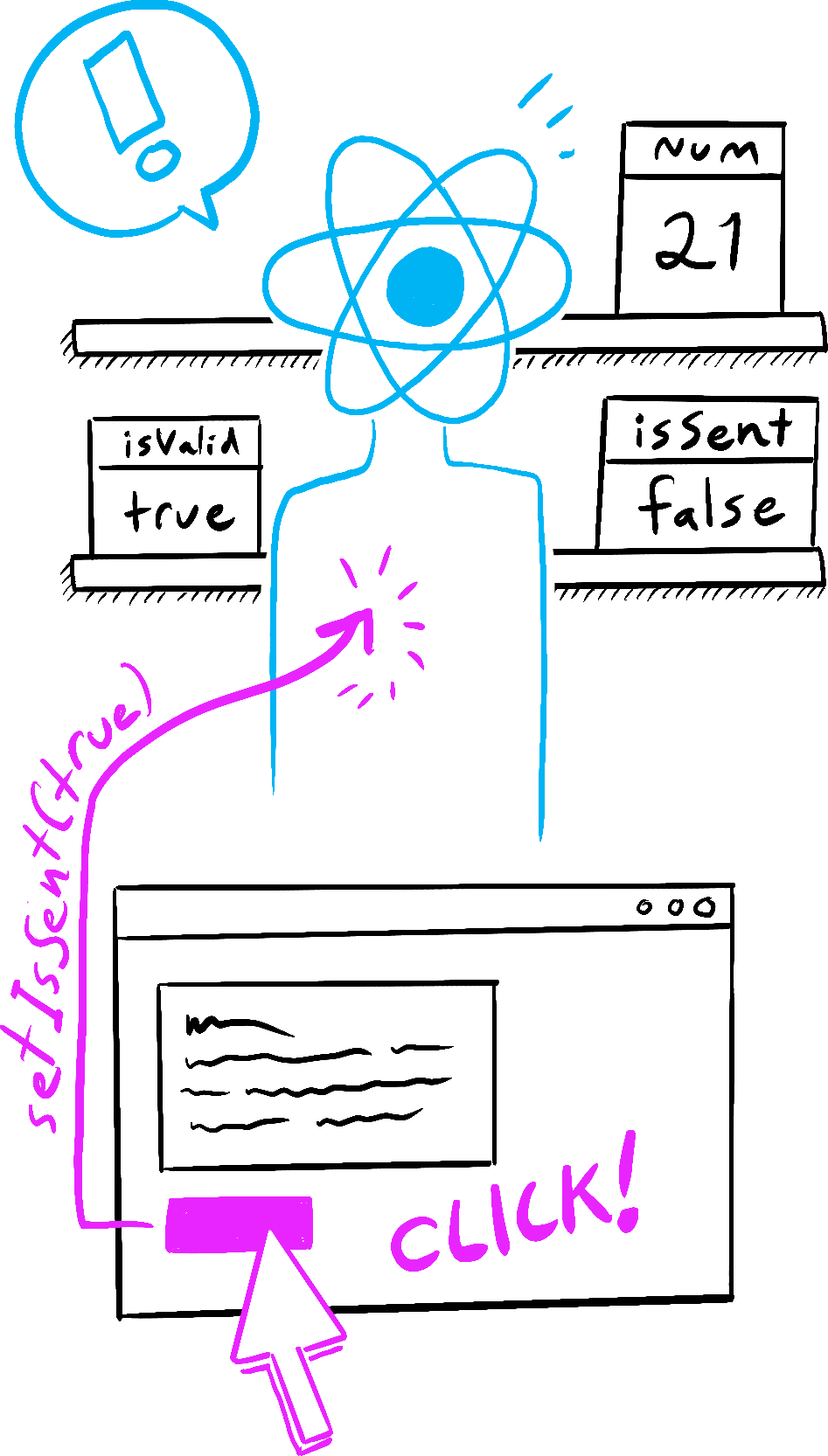 onSubmité executado. setIsSent(true)defineisSentcomotruee enfileira uma nova renderização.- O React rerrenderiza o componente de acordo com o novo valor de